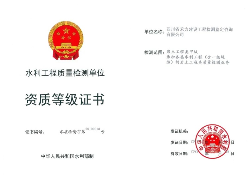 水利工程检测共有五类资质,岩土工程类甲级、混凝土工程类甲级、金属结构类甲级、机械电气类甲级、量测类甲级。禾力检测正式成为拥有五甲资质的公司。